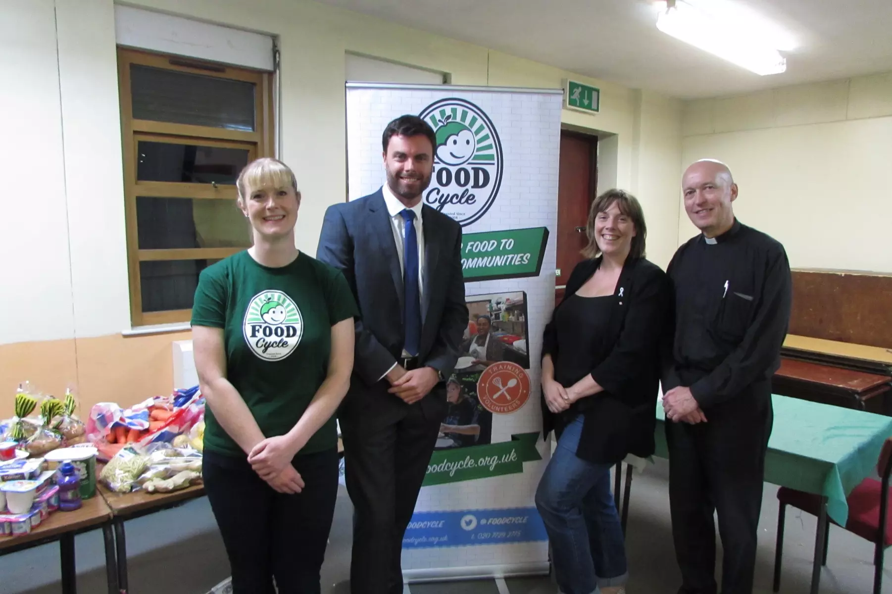 Left to right: Sarah Servante - FoodCycle, Toby Terlet - General Manager, Veolia, MP Jess Phillips, Father Roy Anetts